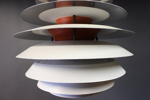 PH Kontrast designet af Poul Henningsen og produceret af Louis Poulsen. Lampen er med hvidlakeret stel og aluminiumslameller delvist hvid- og orangelakeret.