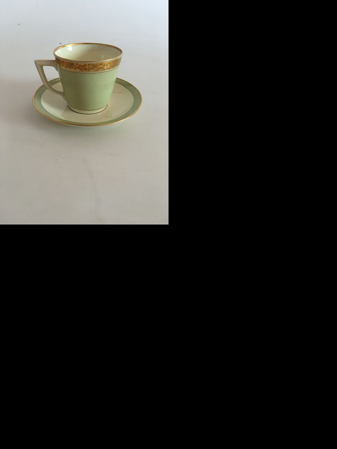 Royal Copenhagen Dagmar Kaffekop og Underkop No. 9481. 17 cl. (5 3/4 oz.) Pistaciegrøn og cremefarvet stel med guldkant designet af Thorkild Olsen i 1930'erne