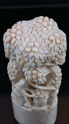 Grønlandica figur udskåret i ben med motiv af kvinder, som plukker frugt. Fejl på figuren - et stykke er limet på.
