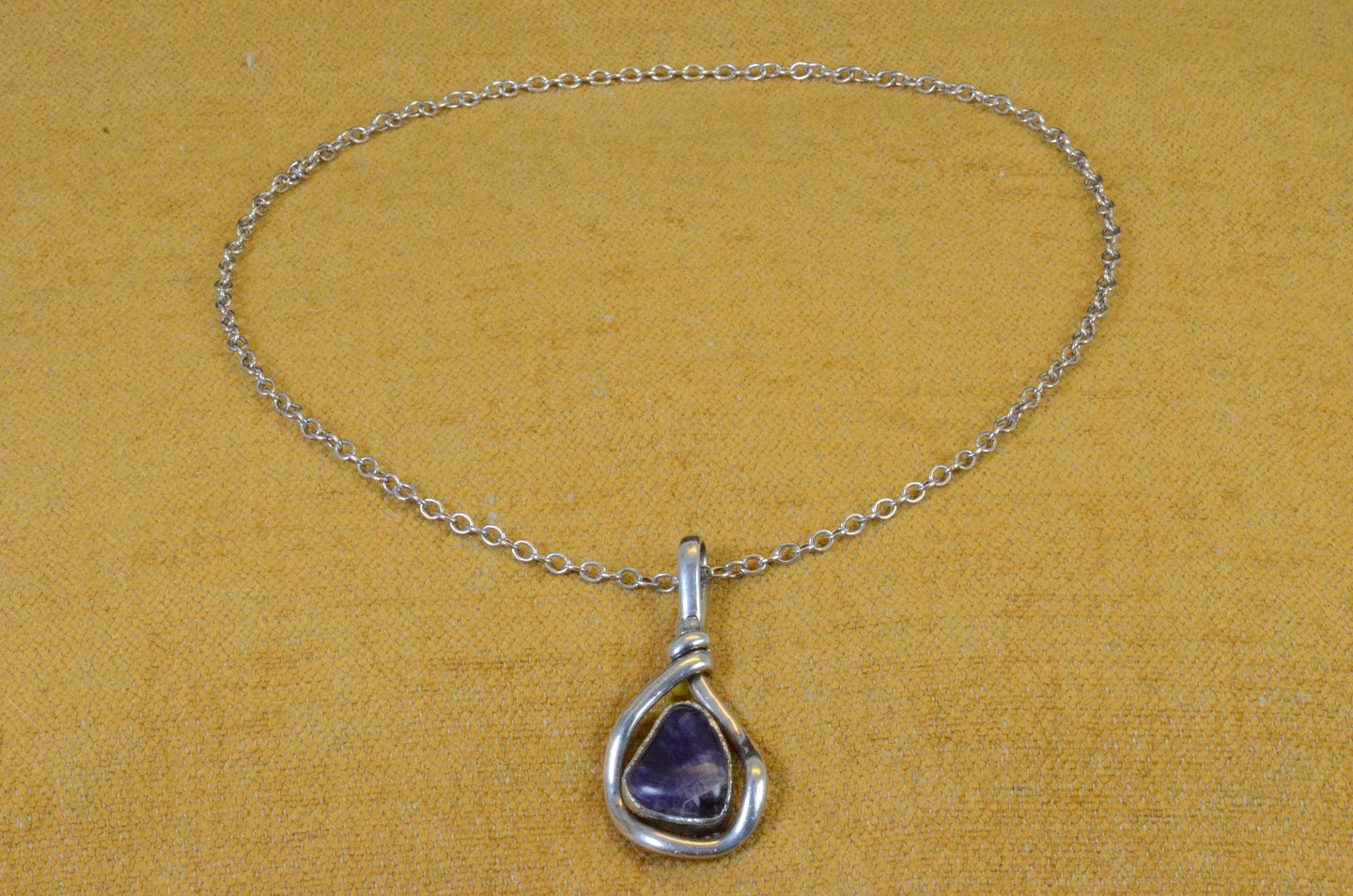 Vedhæng med ametyst 1970'erne i sølvkæde. Unika af Hans Henning ustemplet. Str.: vedhæng 7*3,5 cm , kæde 40 cm. Art No. 76