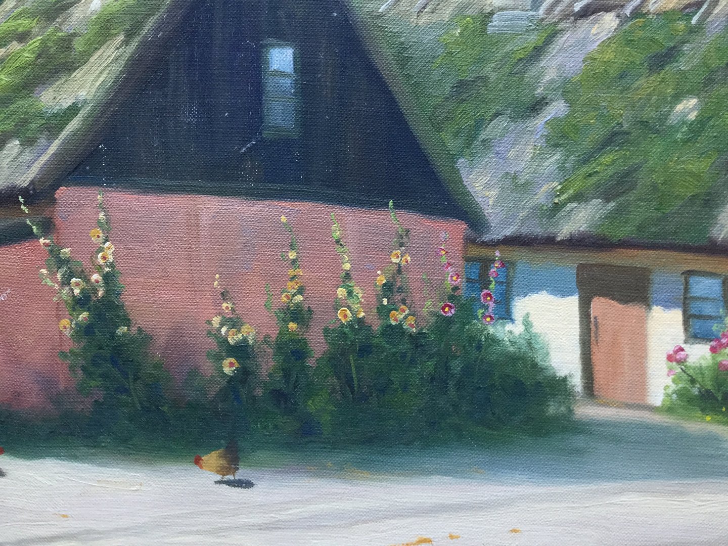 Maleri af Osvald Karms - Landsbygade med stokroser og høns.