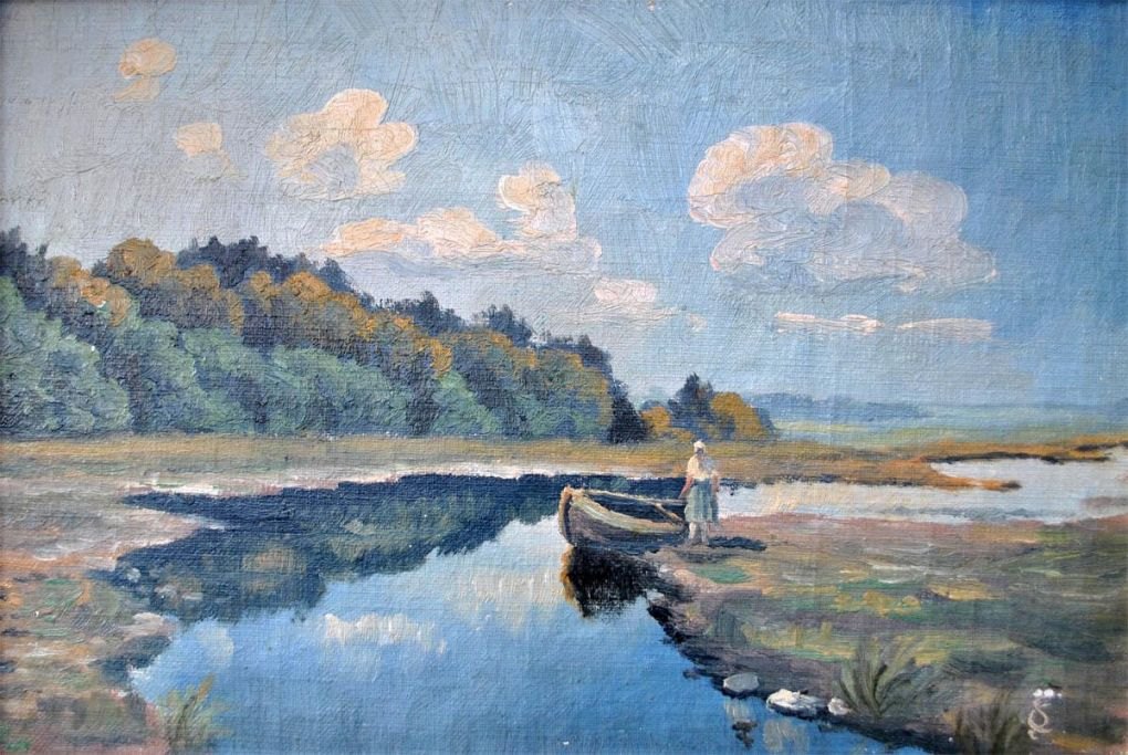 Christensen, Søren (1858 - 1937) Denmark: Woman at the river. Oil on canvas. Signed .: Monogram. 32 x 42 cm.