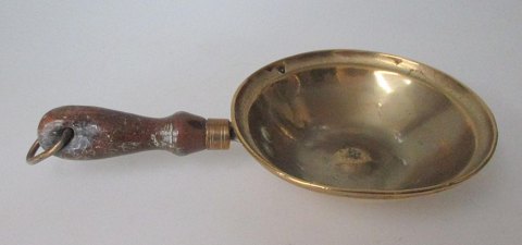 Messing glødeskål, 18. årh. Danmark. Med håndtag af egetræ. Længde: 18,5 cm. Dia.: 11 cm. Ustemplet