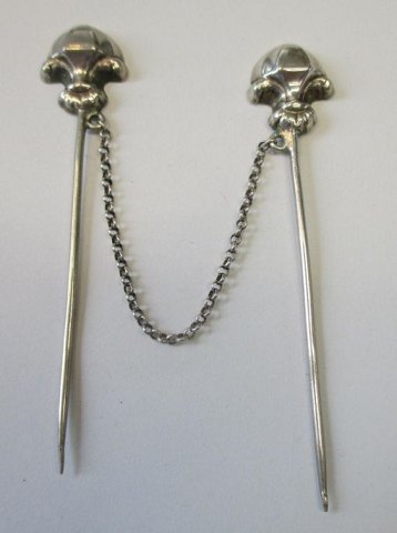 Par dragt nåle med kæde i sølv, Ole Peter Ørnes (efter 1838) Ålborg, Danmark. Stemplet: PØ. Længde.: 7,2 cm.