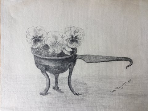 Tegning af Ella Pedersen 1912 - stedmoderblomster i potte.