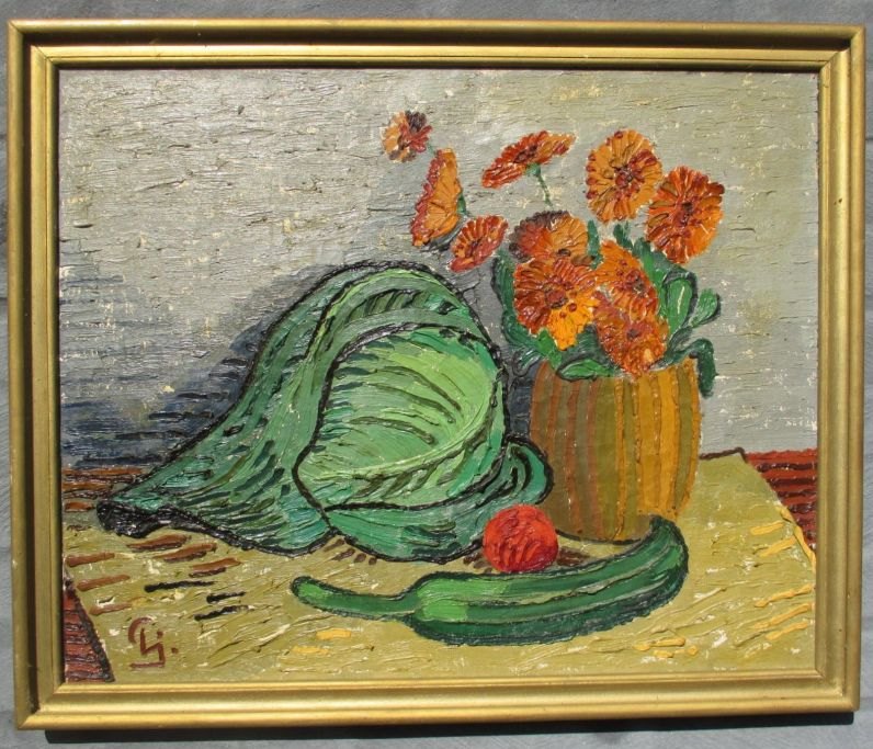 Dansk kunstner (20. årh): Opstilling. Olie på lærred. Signeret: Monogram. 50 x 62 cm.