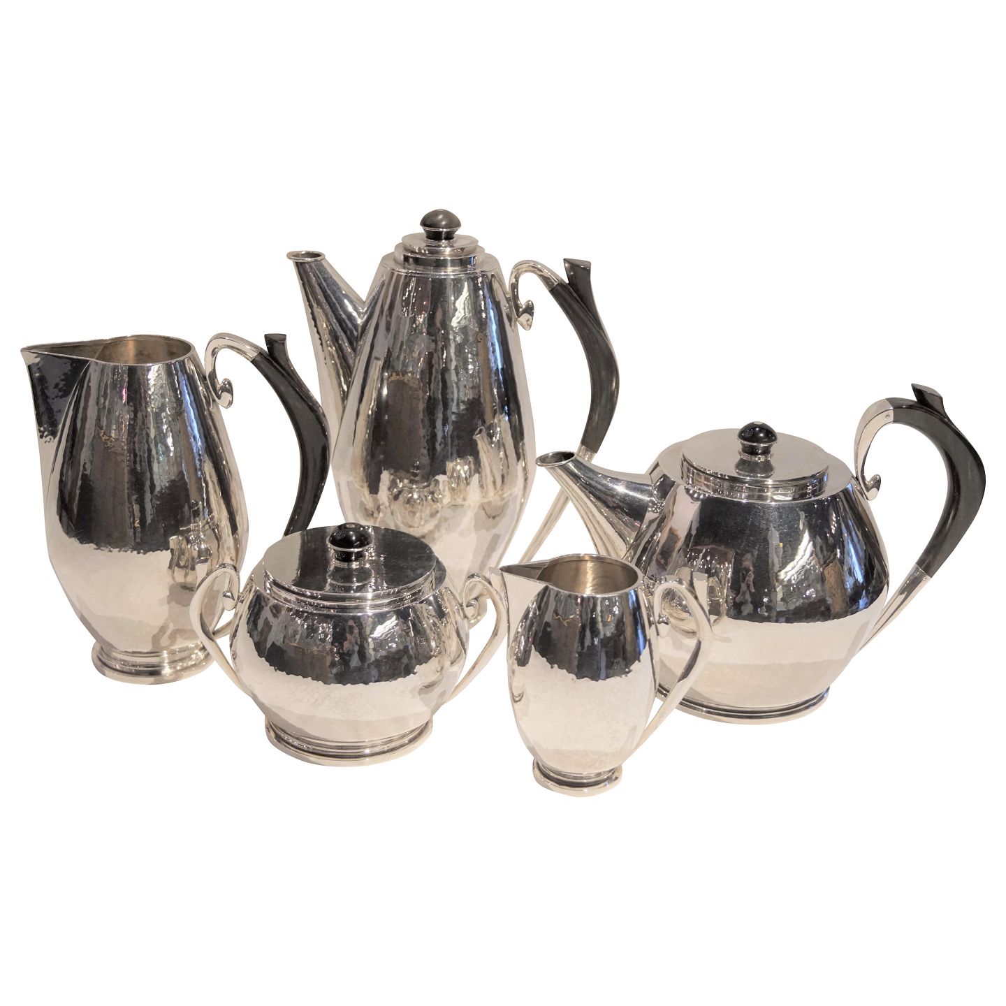 Hans Hansen Kaffe og Theservice i sølv med håndtag af horn lavet i 1953 og designet af Carl Gustav bestående af kaffekande, thekande, sukkerskål, flødekande og stor mælkekande