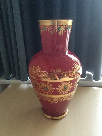 Vase af rødt opaline glas med gulddekoration og grønne sten.