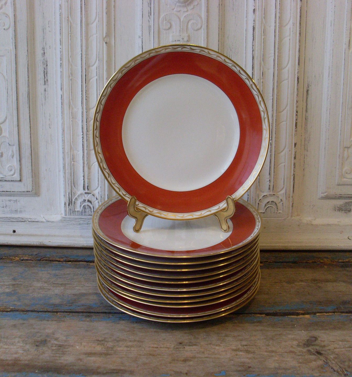 Royal Copenhagen dækketallerkener dekoreret med guld og teglfarvet fane, no. 9785