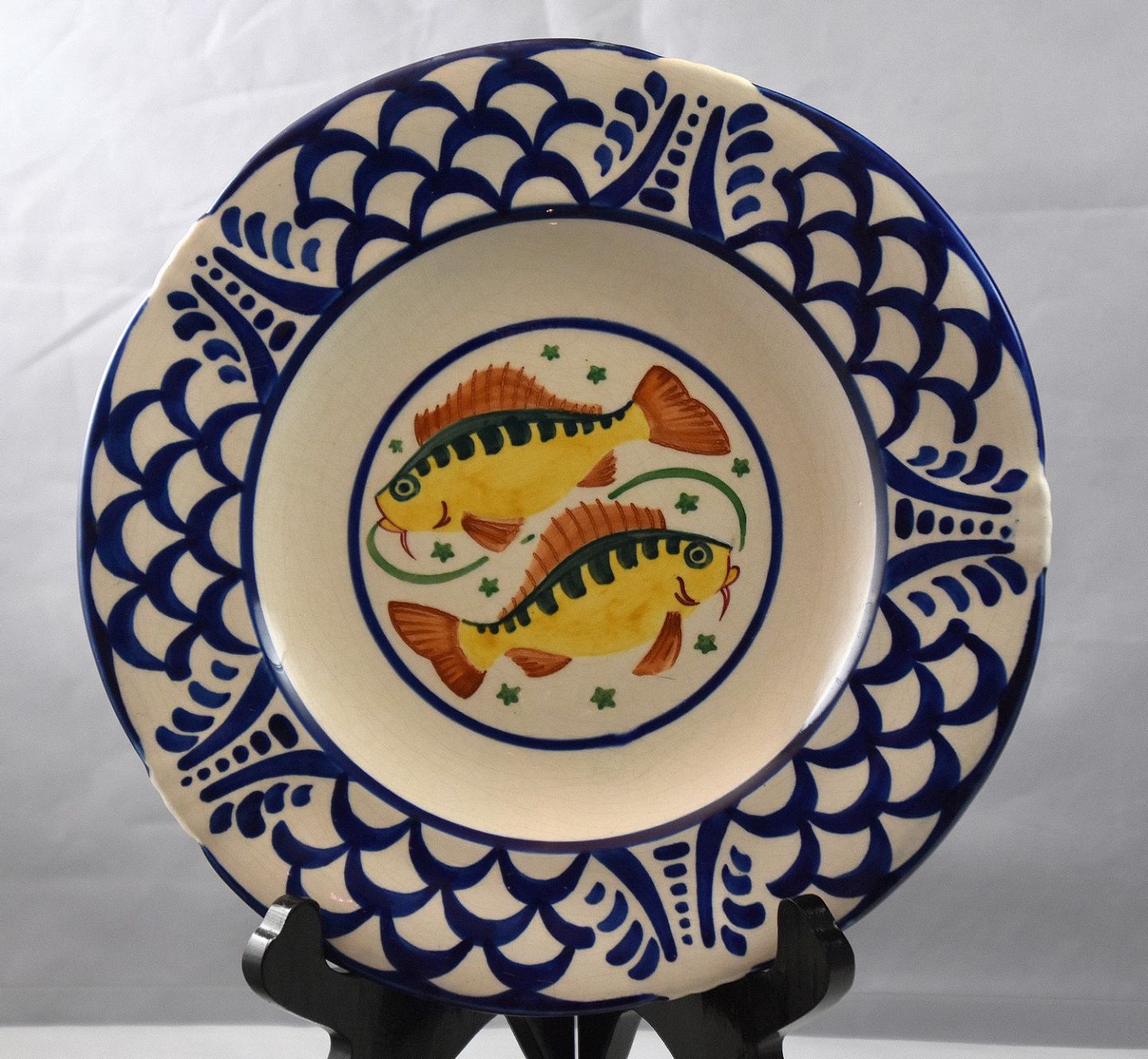 Håndmalet dekoration, på fane blå bølge linjer, i spejl 2 fisk i gule og brune farver.