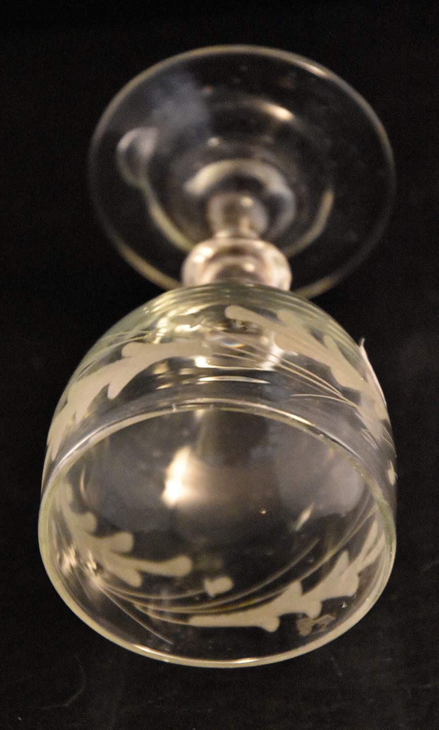 Tysk, formentlig, 1850-tallet. Egeløvsglas. Et vinglas på cylindrisk stilk, med knap. Om kummen en matslebet 7-fliget egeløvsfrise med et agern, skiftevis foroven og forneden stregen hvor på bladene er sat bugter sig. Indvendigt i glasset fremkommer der en opstilkning, en lille knub/forhøjning.