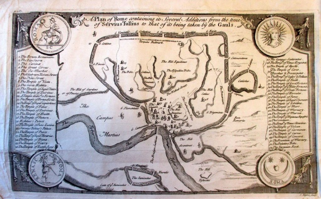 Kort over Rom på Servius Tullius tid, 18. årh. Kobberstik. Stukket af I. Basire. 19 x 30 cm.  Uindrammet.  Tullius regerede i Rom fra 575 - 535 f.Kr.