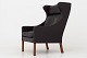 BM 2204 - Nybetrukket Øreklapstol i Paris Brown-læder med ben i teak. Vi tilbyder polstring af stolen med stof eller læder efter eget ønske. Kontakt os venligst for mere information.