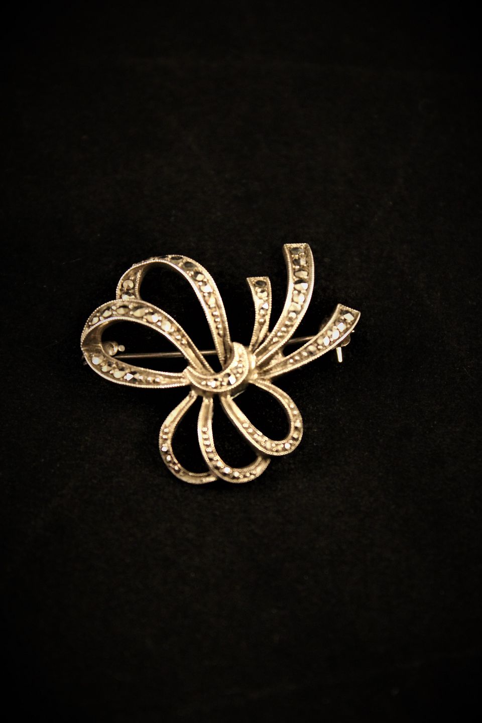 Gammel broche i sølv med masser af små skinnende magasiter.