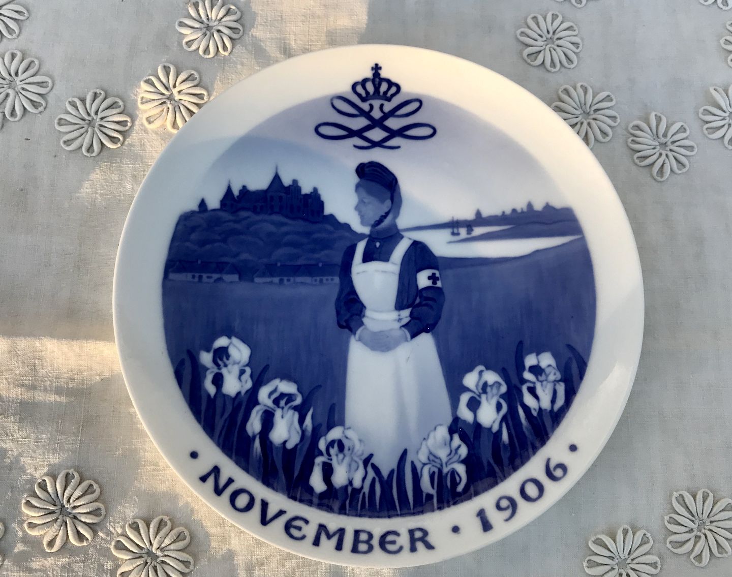 Royal Copenhagen, Vestindisk syge og børnehjem, Røde kors sygeplejeske i landskab, November 1906, Dronning Louises kronede monogram, 20cm i diameter, Fremstillet i 300 eksemplarer, Design Christian Thomsen *Perfekt stand*