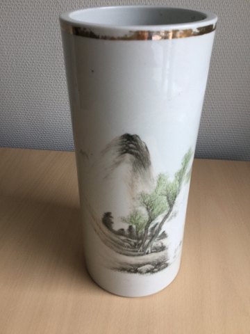 Text zugänglich auf Dänische: Hatstand vase dekoreret med landskab og guldkant.