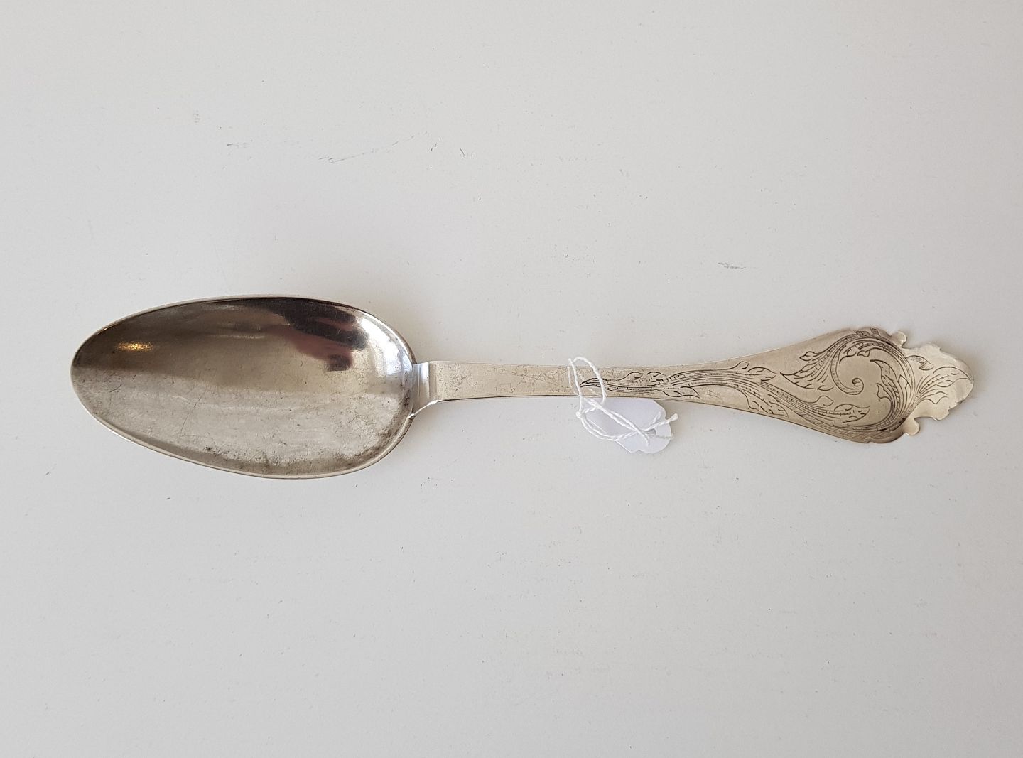 Barok spiseske i sølv 1700tallets 2. halvdel. Stempel HFS i hjerte, er lavet af Hinrich Friedrich Schrøder, Meldorf. Gift 1763 og 1794 i Glückstadt. Død 1802 i Meldorf