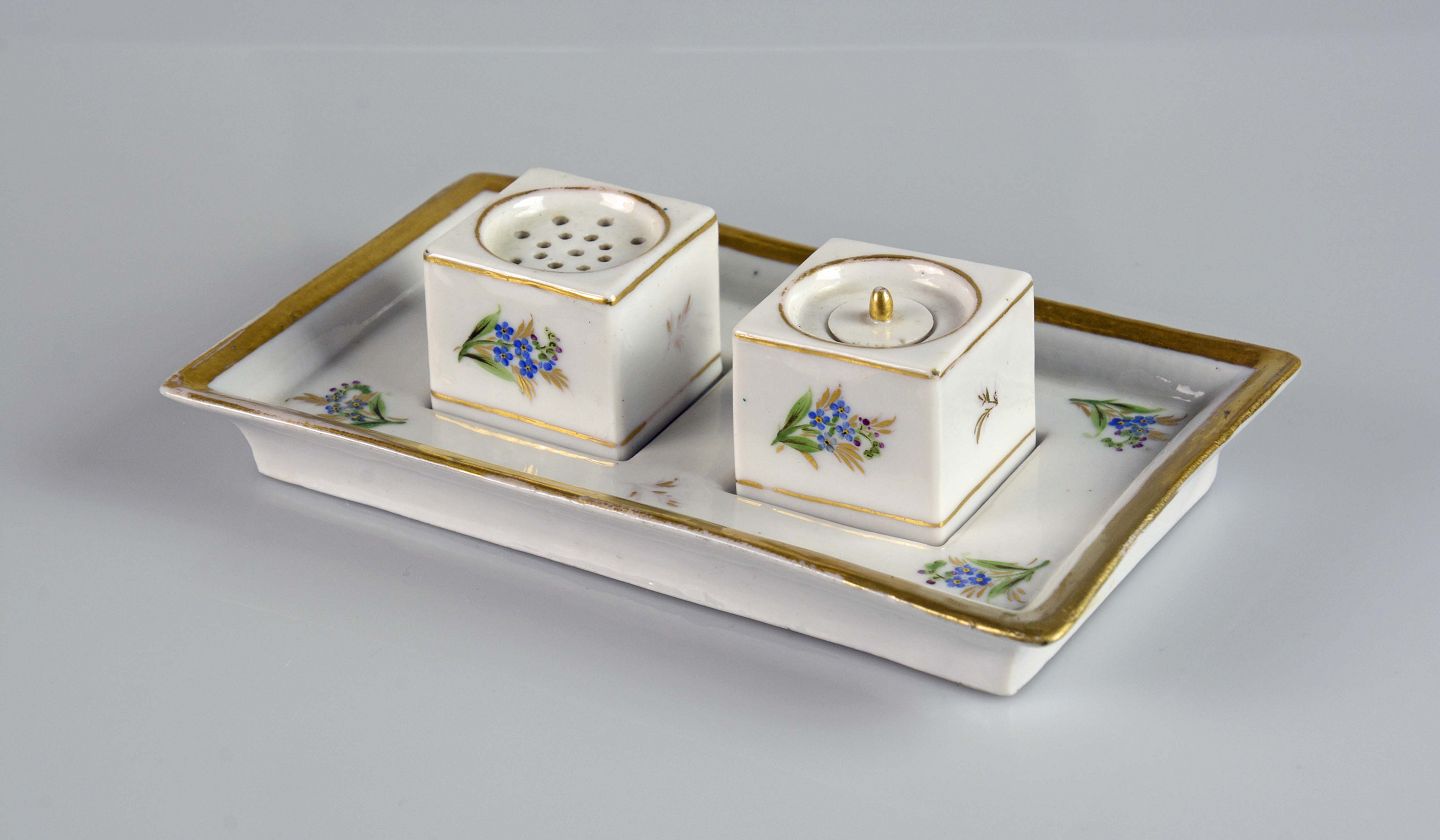 Sættet består af en porcelænsbakke, et blækhus med låg samt en strødåse.