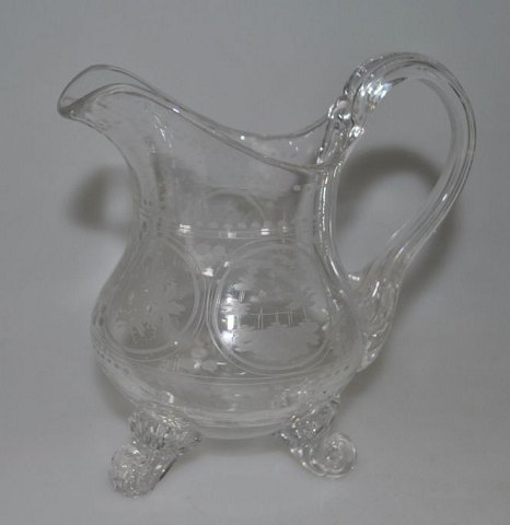 Fløde kande i klart glas, o. 1900, Tyskland. Med slibninger i form af blomster og landskaber. Med snegle hank og ben. H.:12 cm.  Perfekt stand!