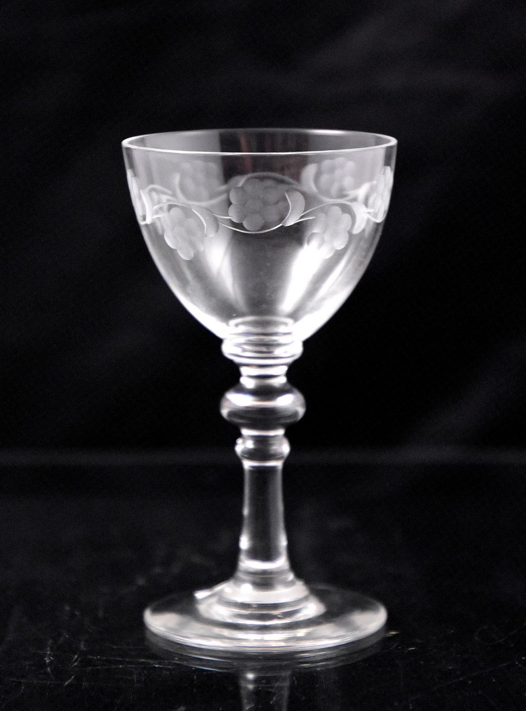 Rosenborg krystalglas med karformet kumme, rund stilk med 2 knopper. Kummen er slebet med blomsterranke mønster. Rosenborg udgår i 1970