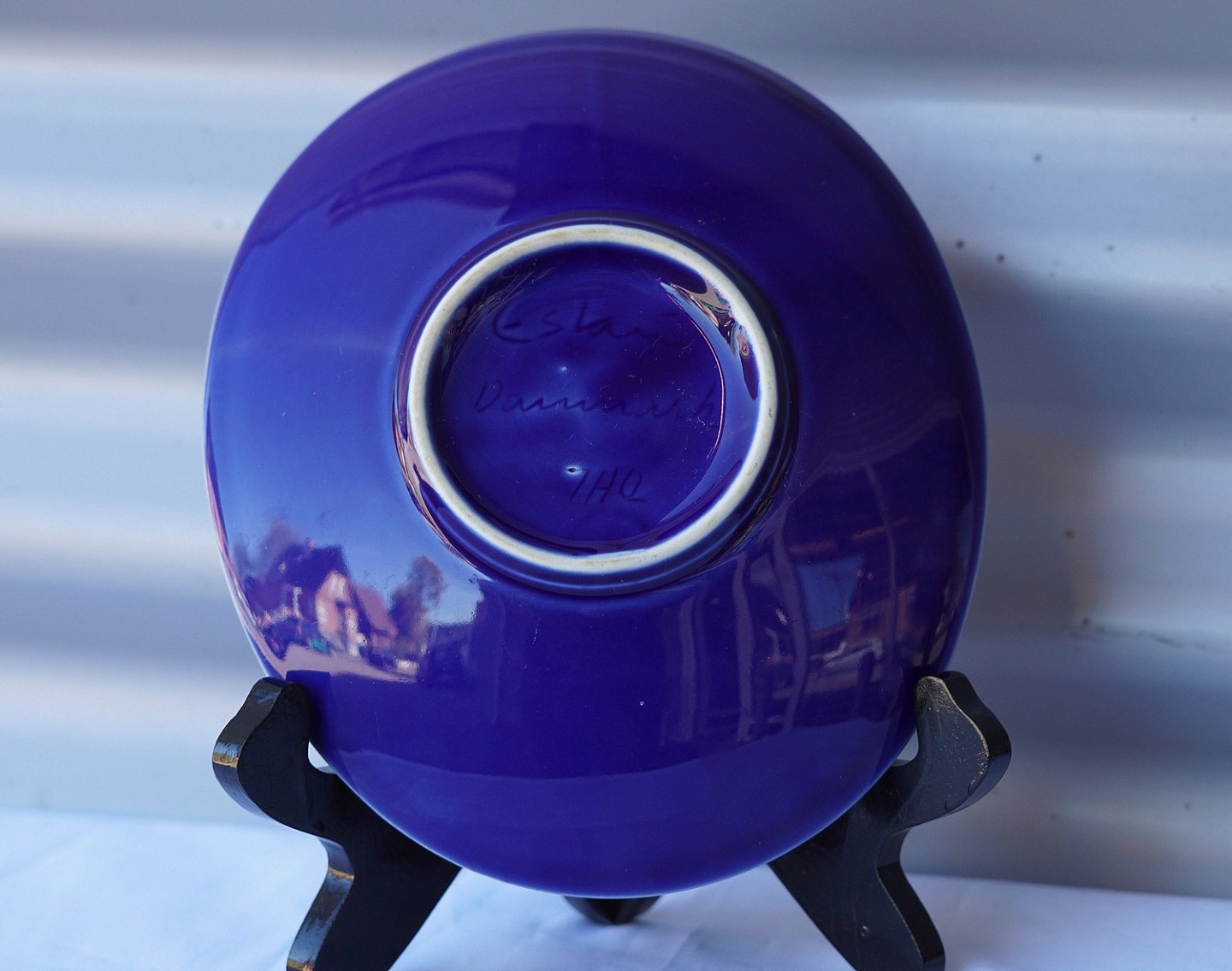 Rundt fad, blåt, med livets træ fyldt med hjerter og smådyr