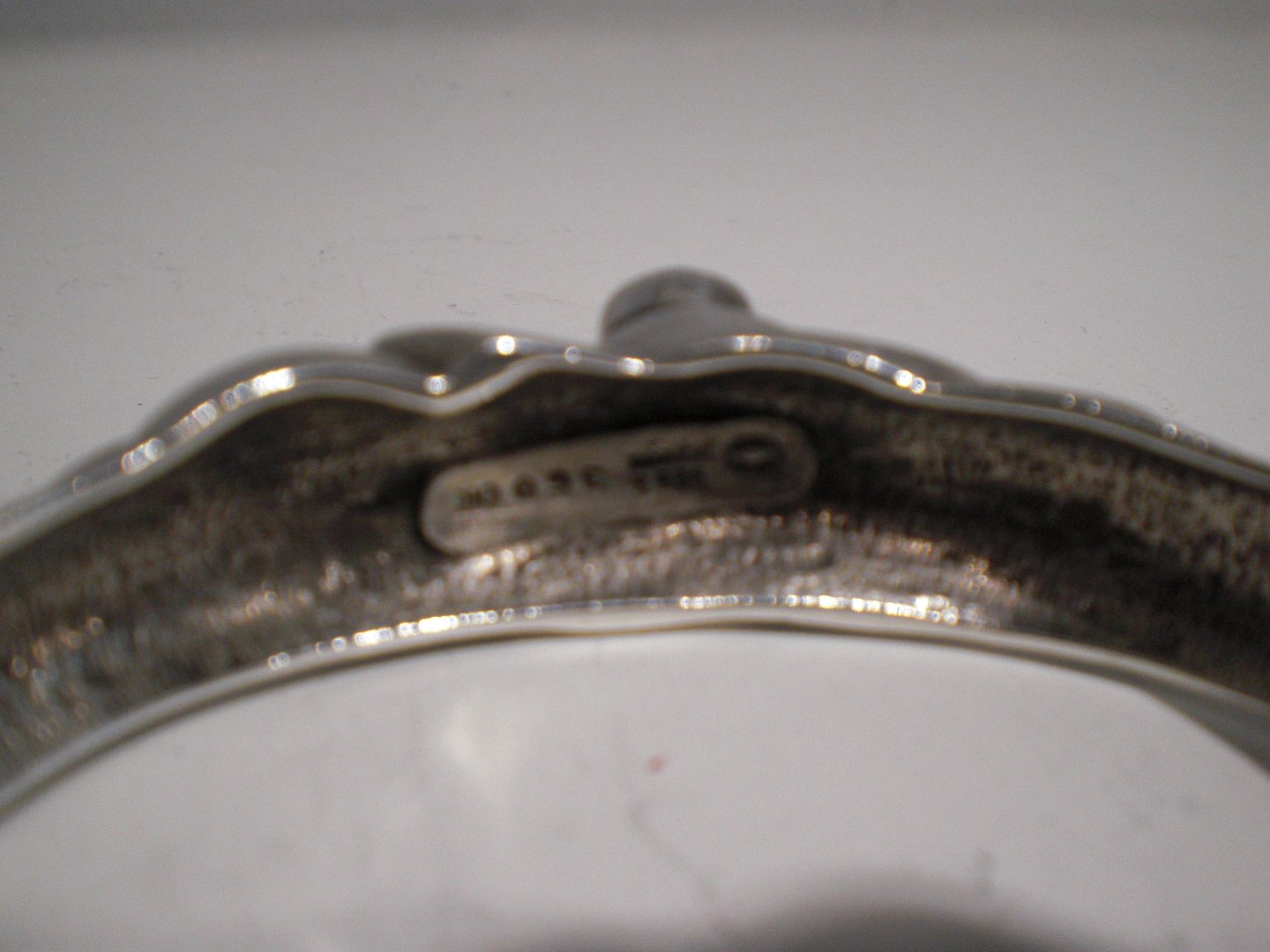 Georg Jensen (1909 - ) åben armring i sterling sølv med carboconsleben månesten designet af Ole Kortzau (1939 - ). Dekoreret med stiliseret bladværk. Stempel efter 1945 - design 360 - signeret OK. Vægt med månesten: 40 gram. Længste indre diameter: 5,9 cm.