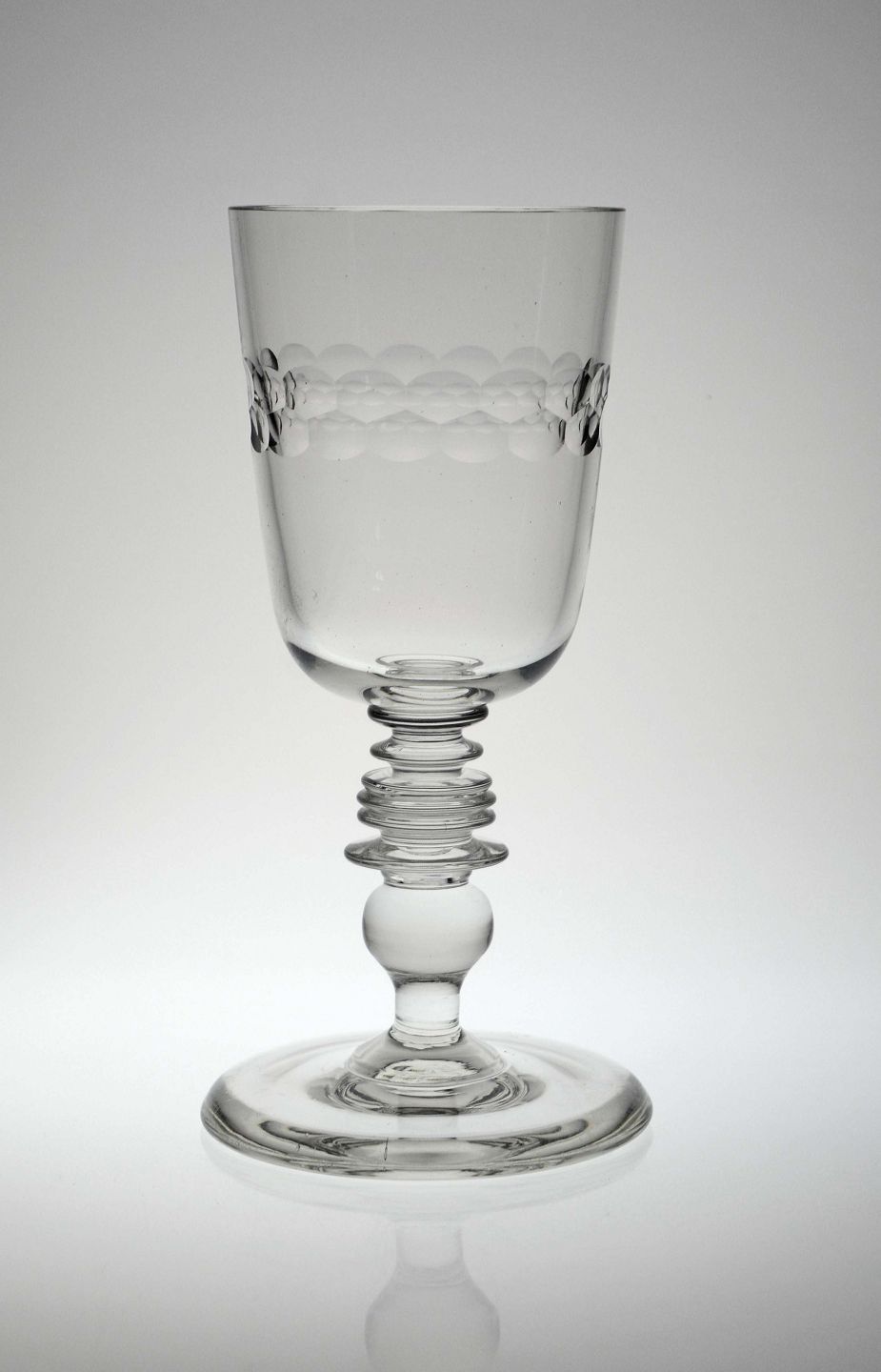 Pokalglas med bikageslibninger, glattet i bund. Et lignende glas er i Holmegaard prøvesamling, se hvide glasbog fig 145