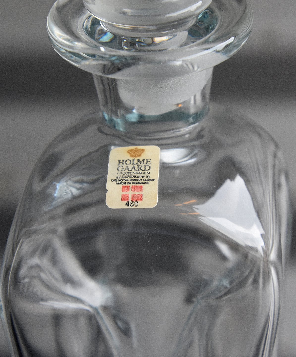 Klukflaske "Træt Viol", Klart glas med, massiv, klar kongekron prop. Klukflaske er kvadratisk i skuldre og bund. Halsen er drevet og indboret for massiv prop
