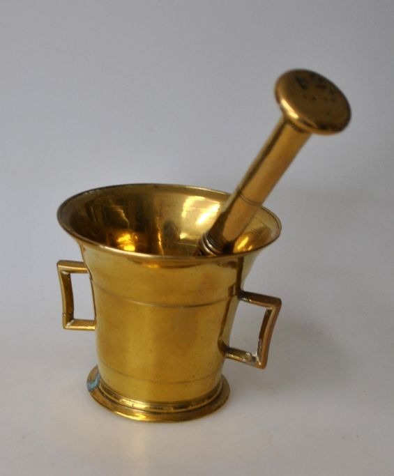 Messing morter med pistil, 19. årh. Danmark. H.: 9,5 cm. Længde pistil: 18,5 cm.