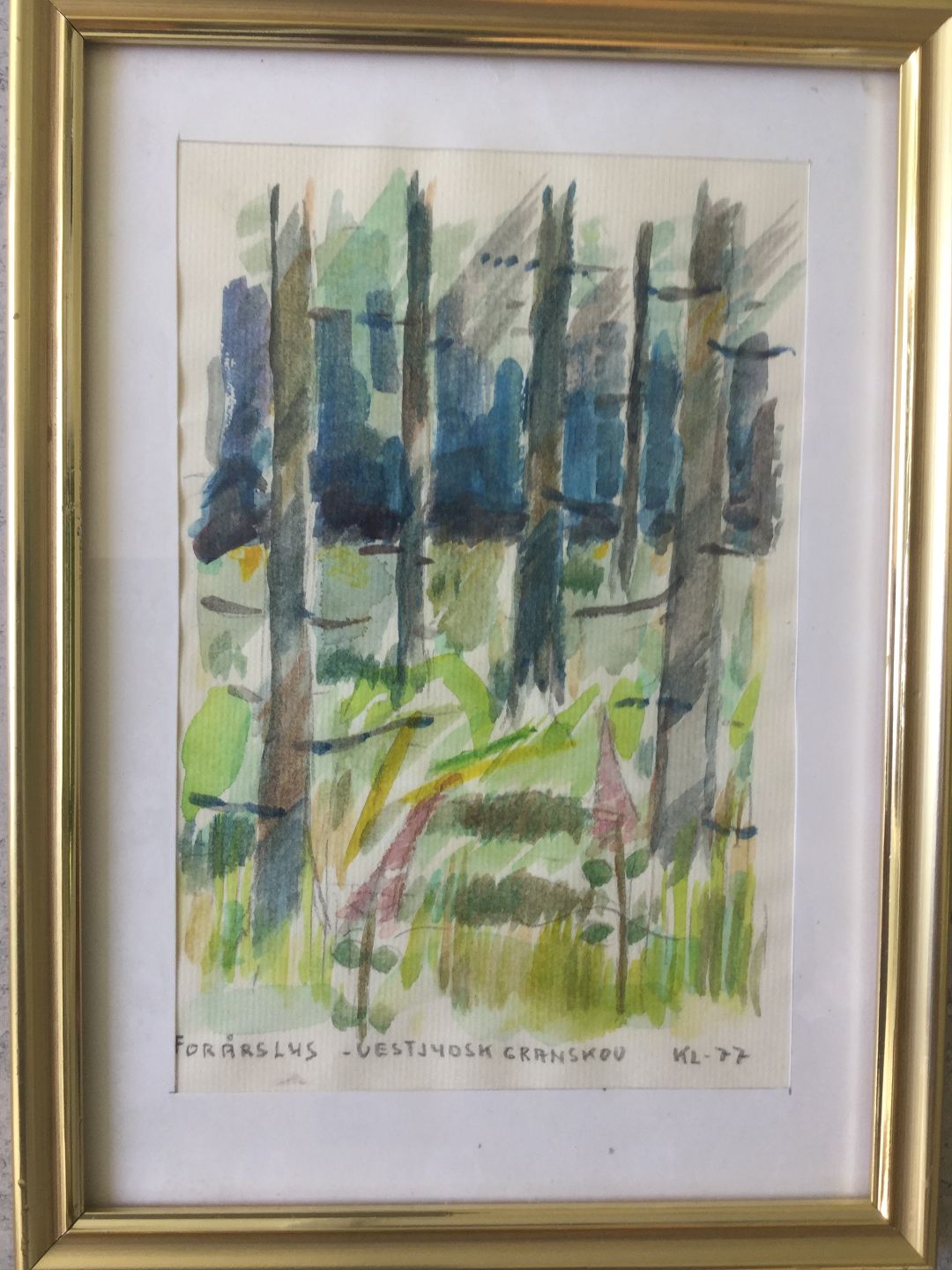 Akvarel af Knud Laursen - Forårslys - Vestjysk Granskov 1977.