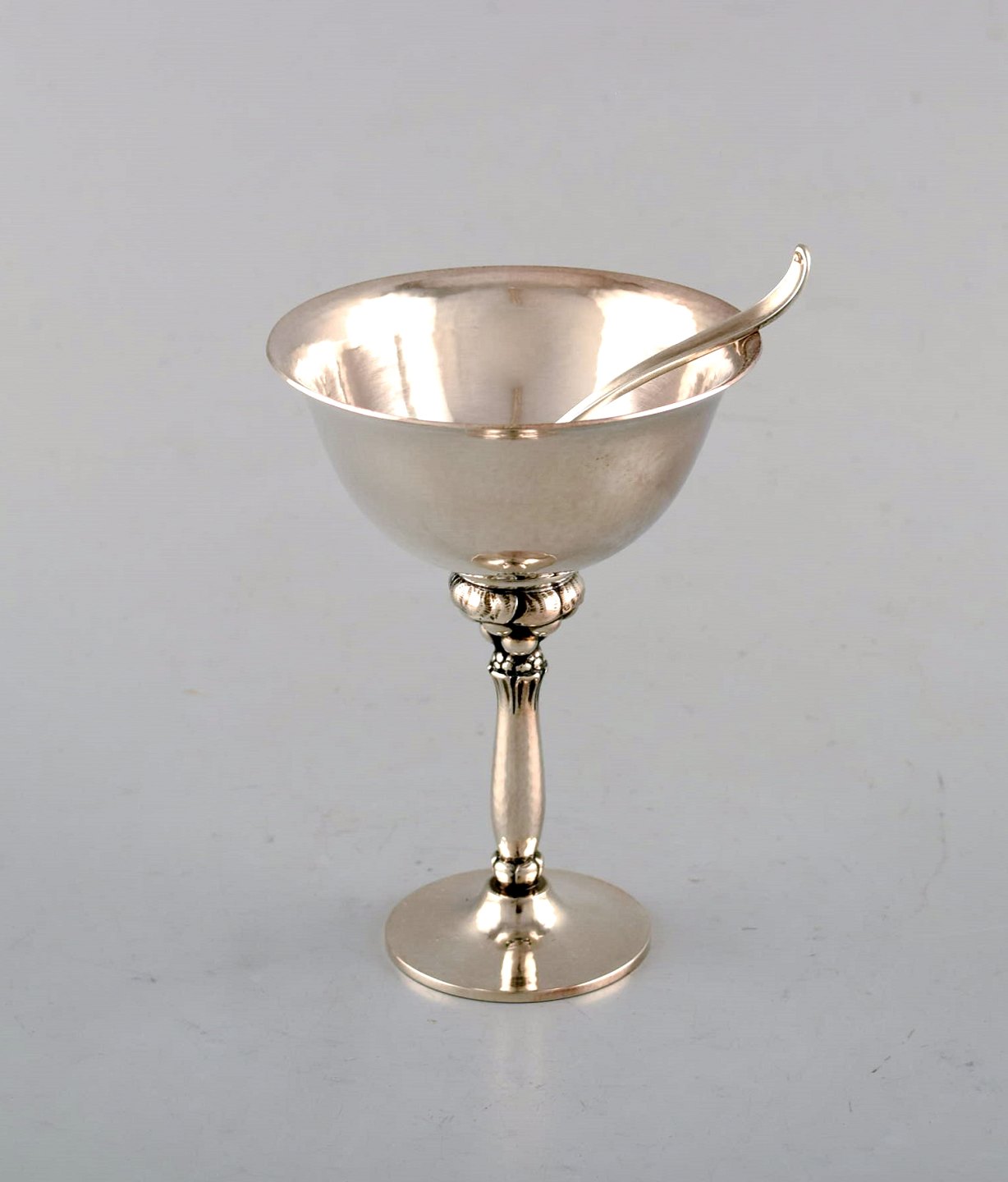 Harald Nielsen for Georg Jensen. Et sæt på seks cocktailbægre af hammerslået sterlingsølv samt seks cocktailspyd. Dessin 479 A og 68 A.