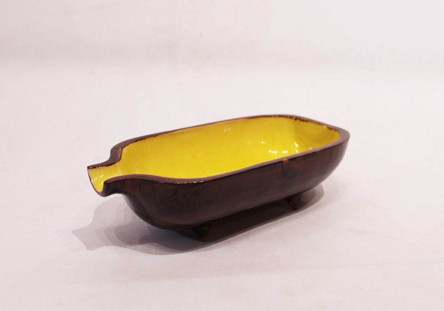 Keramik skål på fødder med brun glasur udvendig og gul indvendig, dansk design, 1960erne.