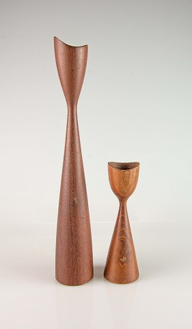 Et sæt lysestager i teaktræ med svungen topkant