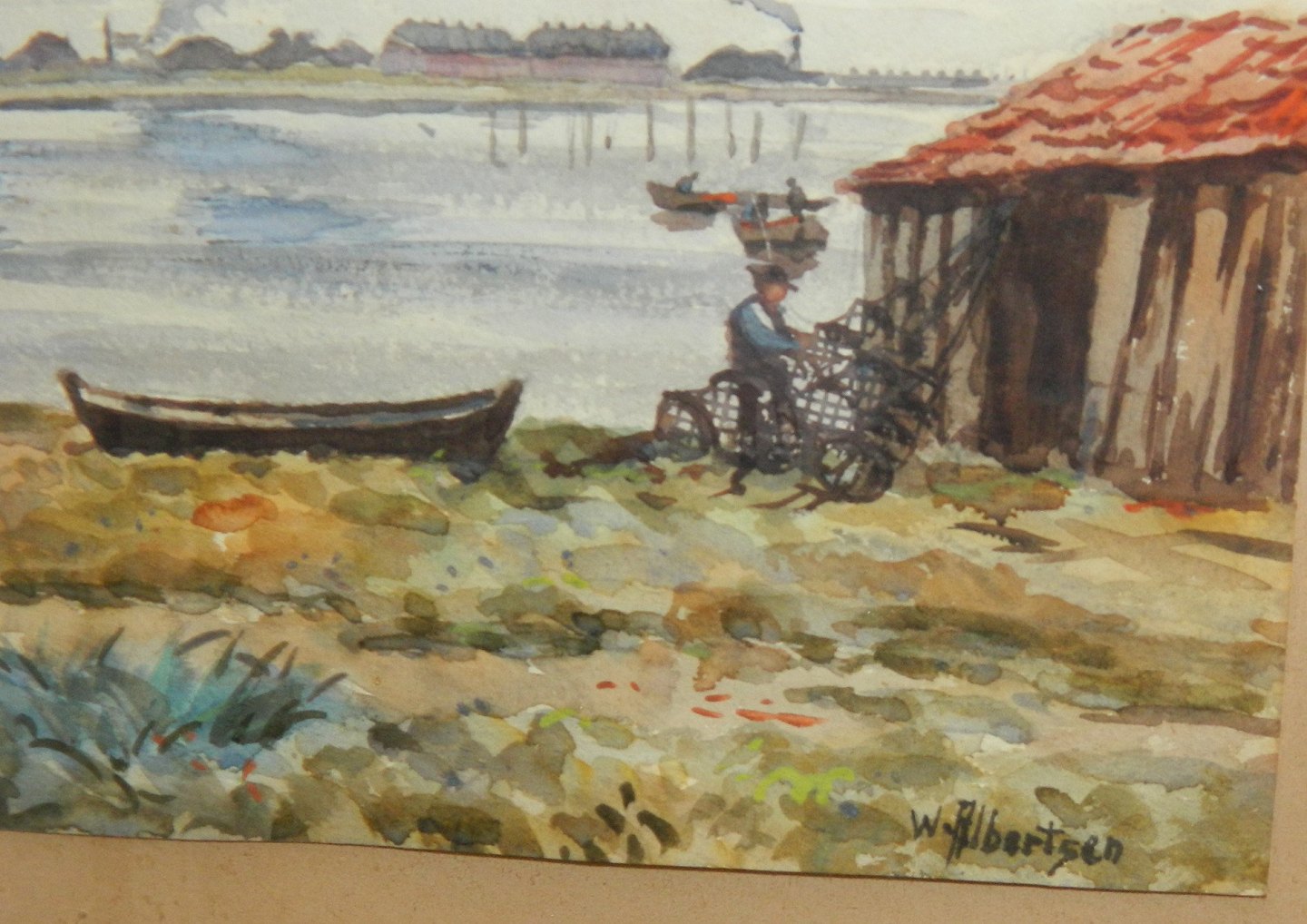Indrammet motiv af Aalborg. Malet af Waldemar Albertsen (1868-1954). Akvarel. Kystmiljø fra Aalborg med skibe i baggrunden fra begyndelsen af 20. århundrede. Signeret W. Albertsen. Ramme mål: 51½ x 67 cm. Papir / akvarel mål: 31½ x 47½ cm.