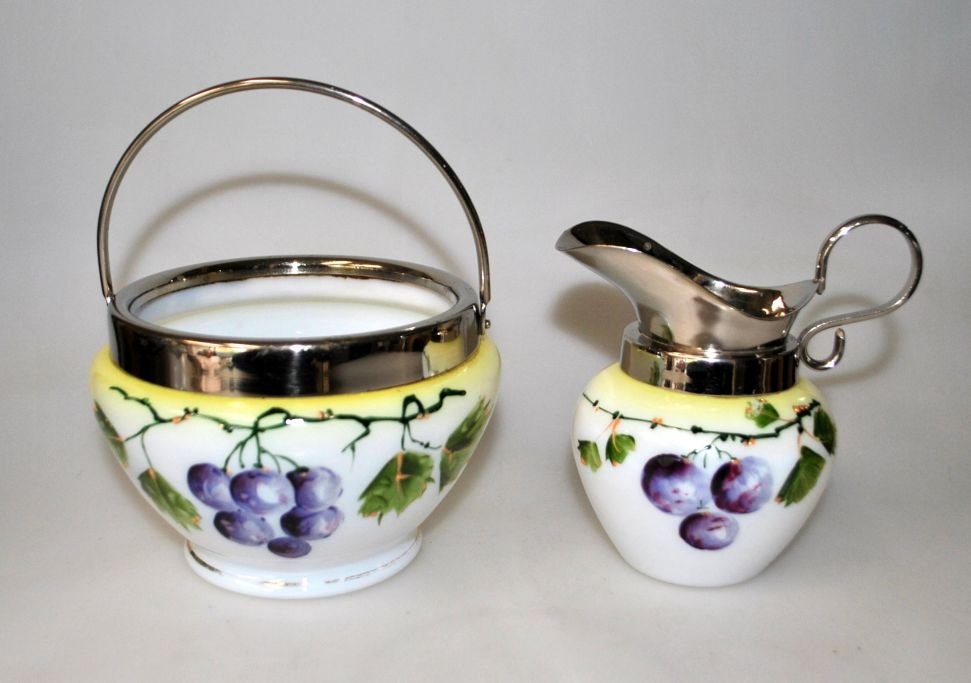 Sugar / cream set in opaline glass with enamel decorations with fruit, approx. 1910. Germany. With nickel. Height pitcher: 10 cm. Height bowl without handle: 8 cm.