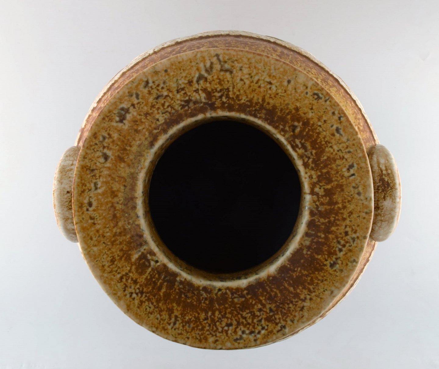 Gunnar Nylund for Rörstrand. Kolossal unika gulvvase med geometrisk mønster i glaseret stentøj. Smuk glasur i lyse jordnuancer. Tidlig unikavase fra 1940'erne i museumskvalitet.