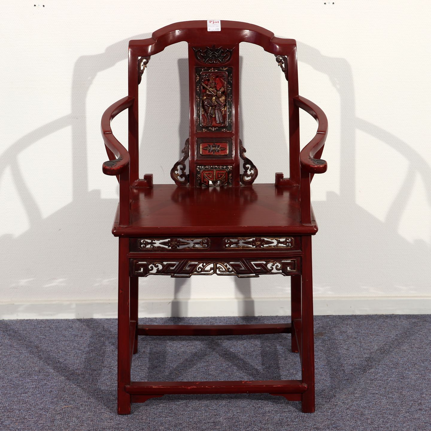 Rødlakeret orientalsk armstol med udskæringer,
