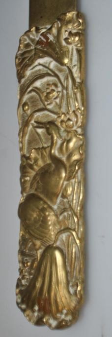 Stor japansk papir kniv i messing, 19. årh. Håndtag dekoreret med traner og bladværk. Blad med fugle og blomster. L.: 36,5 cm.