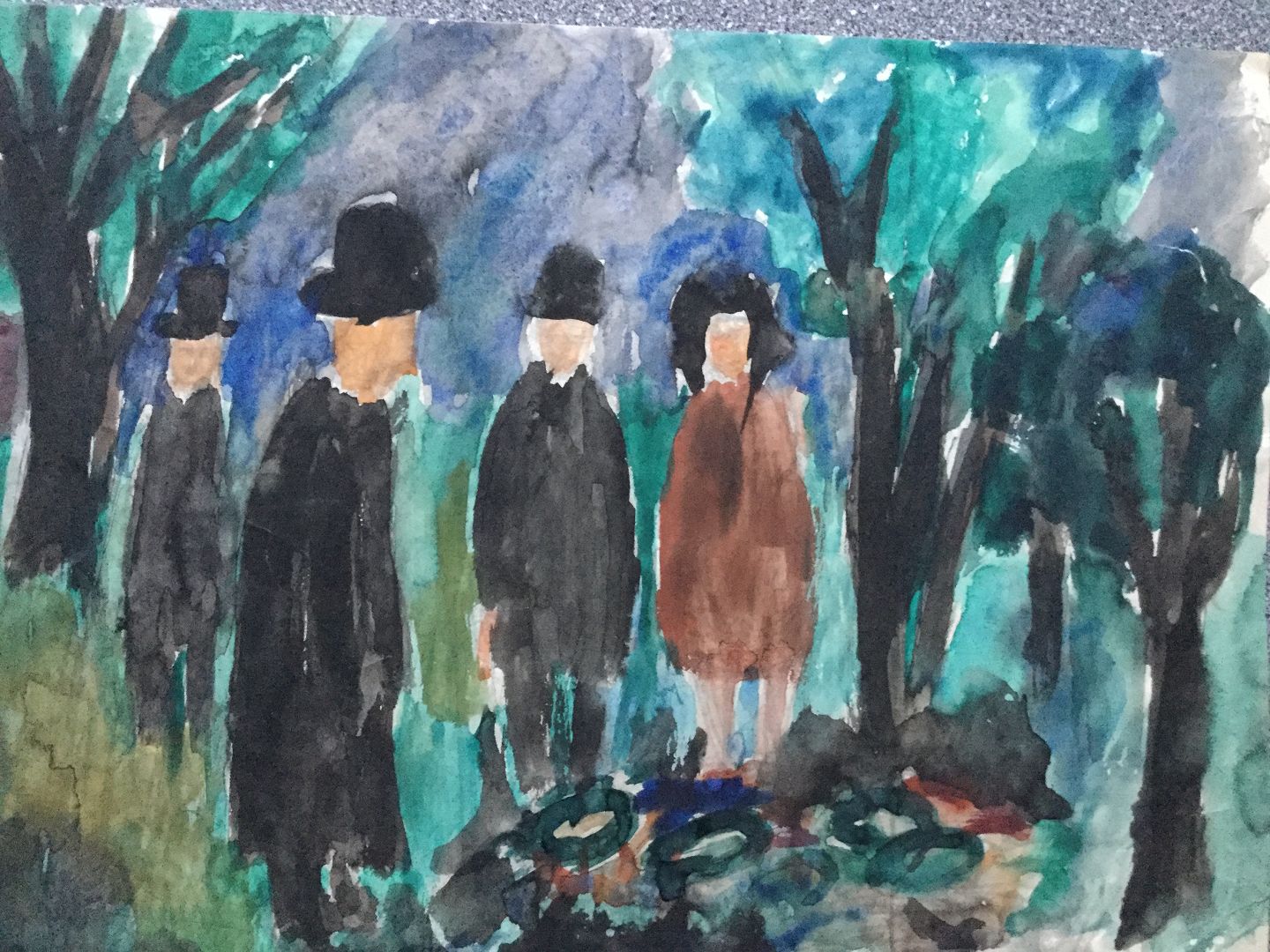 Akvarel af Peder Brøndum Sørensen - Begravelsesscene.