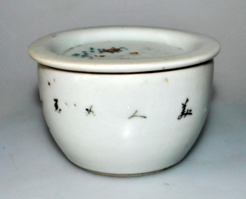 Kinesisk cicade bur i porcelæn, 19./20. årh. Håndmalede dekorationer med kvinde og barn i have. Med tekst. Stemplet. Gennem brudt låg med dekorationer af blomster. H.: 6 cm. Dia.: 9 cm.