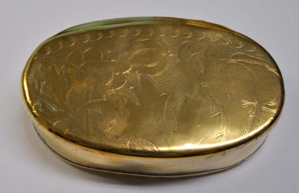 Tobaksdåse af messing, oval, 18.årh. Holland. Dekorationer på låg med valmuer. L.: 11,5 cm. B.: 7,5 cm. H.: 3 cm.