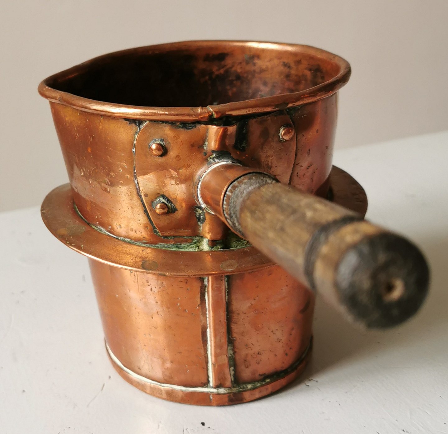 Kobbergryde med håndtag i træ. Fremstillet anden halvdel af 18. århundrede. I god stand uden skader eller reparationer. Stemplet på bunden. H. 12½ cm høj