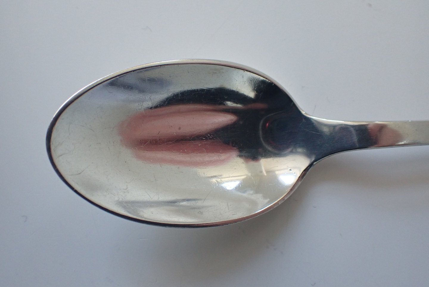 John A. Rasmussen (1938 - 1958) barneske i tretårnet sølv fra 1946. Håndlavet med smuk blomster dekoration på skaft. Vægt: 24,6 gram. Længde: 14,6 cm. I fin stand.