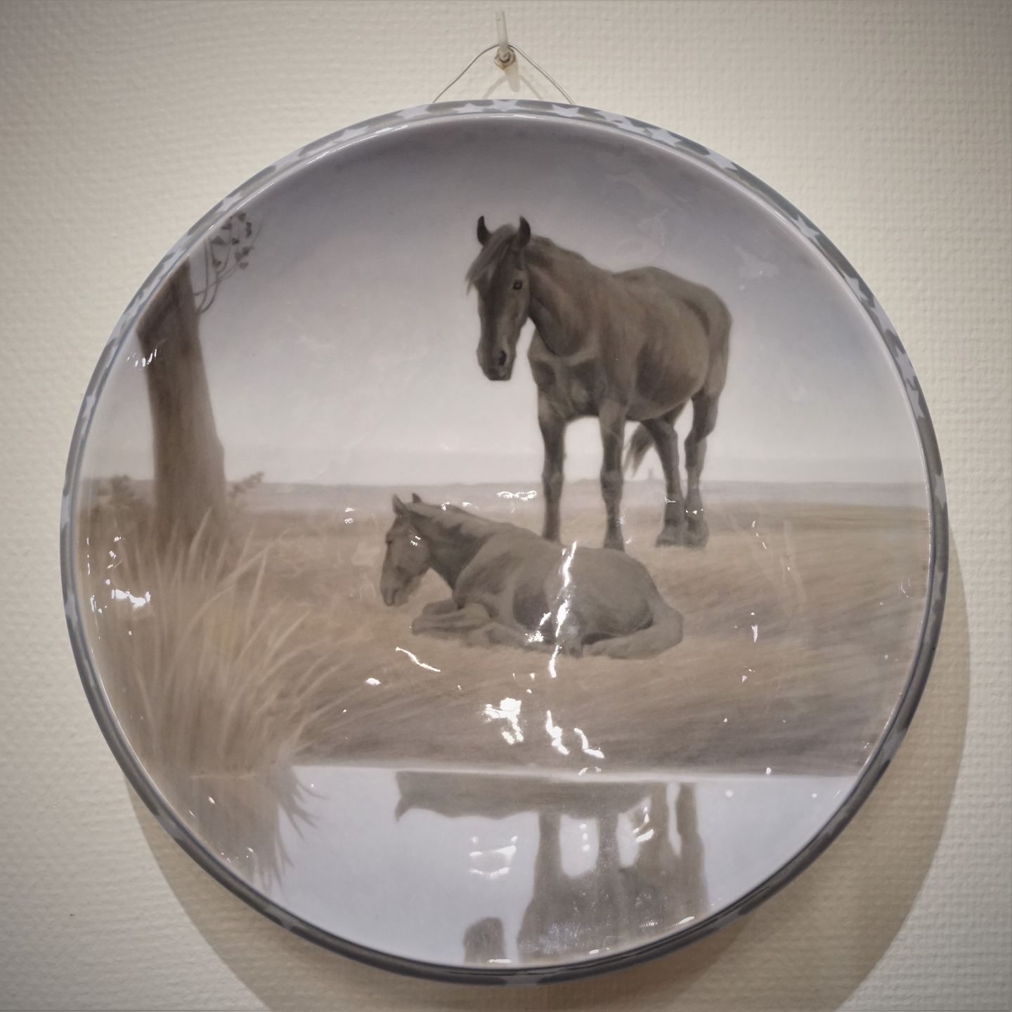 Gotfred Rode for Royal Copenhagen; Stort rundt fad af porcelæn med hestemotiv, ophæng.