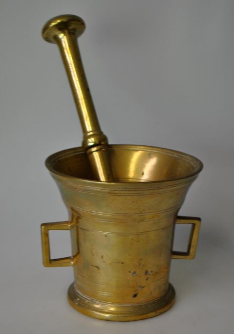 Messing morter med pistil, 19. årh. Danmark. Med to hake. Højde: 11 cm. Længde pistil: 22 cm.