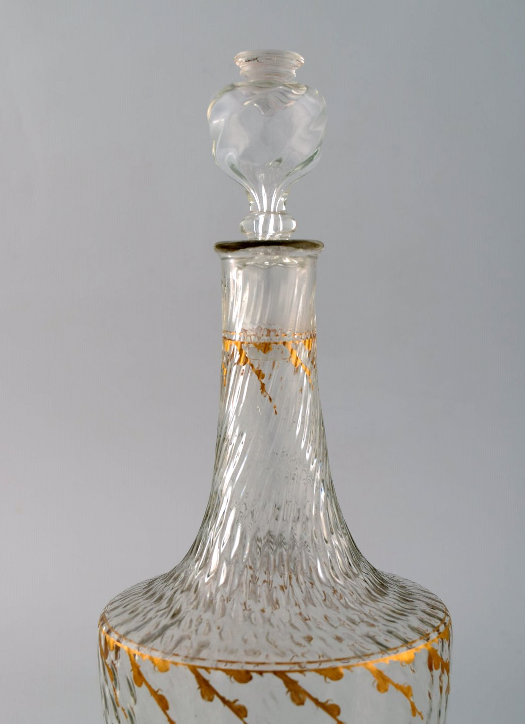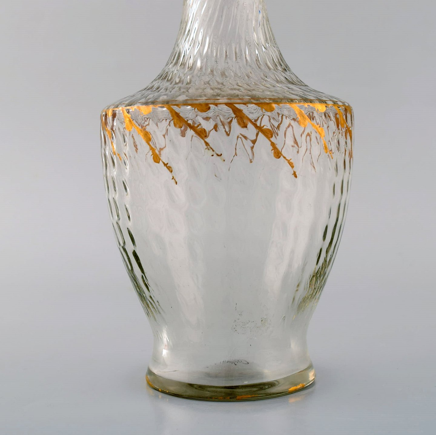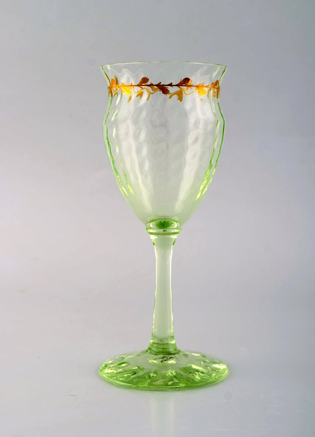 Emile Gallé (1846-1904). Seks tidlige og sjældne vinglas samt karaffel i mundblæst lysegrønt kunstglas med håndmalede guldekorationer i form af blade. Museumskvalitet, 1870/80'erne.