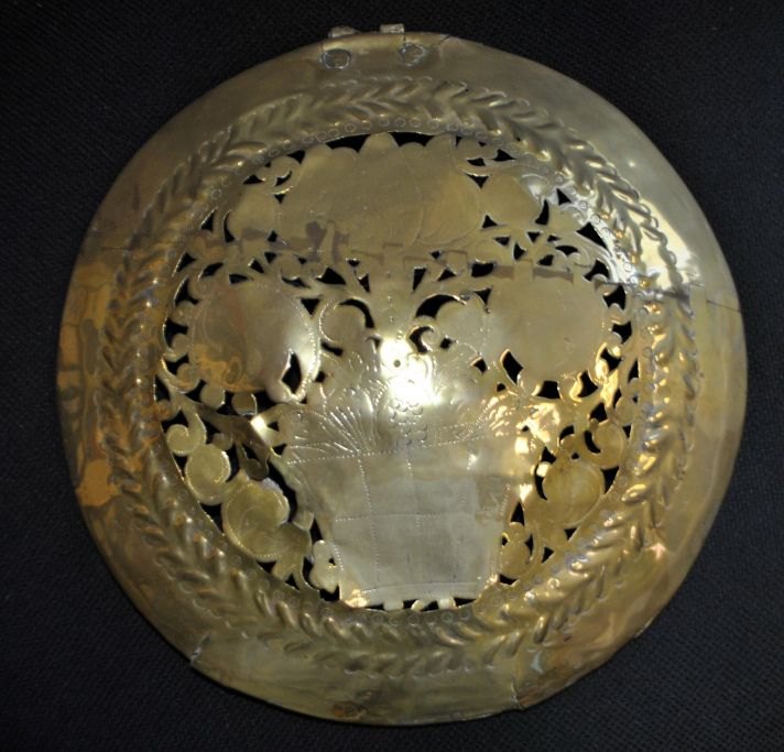 Varmebækken låg i messing, 18. årh. Danmark. Dekoration med roser i en kurv. Dia.: 28,5 cm.