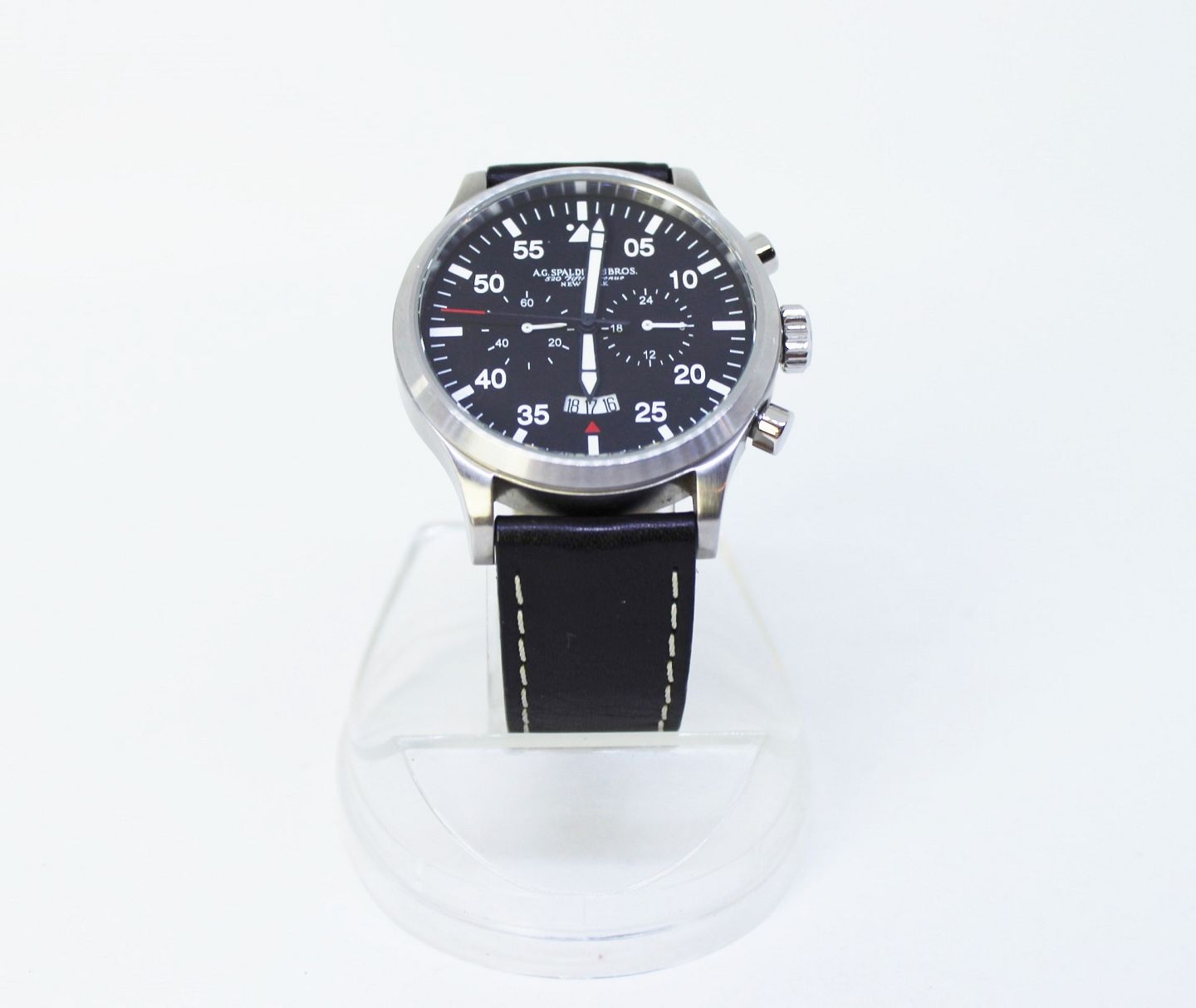 AC Spalding & Bros men's watch of stainless steel with quartz and chronograph. The watch is water resistant 5 ATM and with a black leather strap.