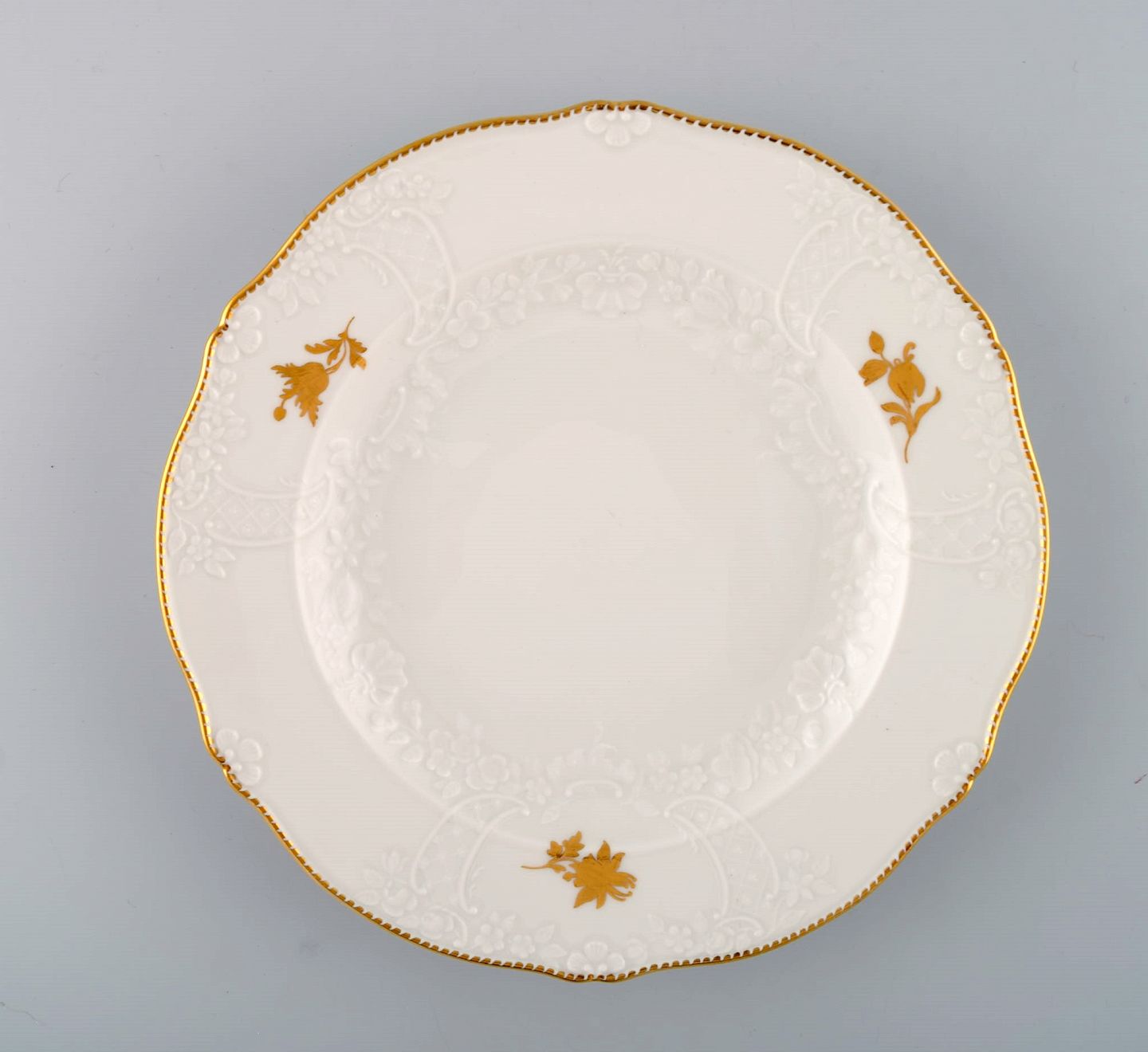 Meissen frokosttallerken i porcelæn med blomster og bladværk i relief og gulddekoration. 1900-tallet.