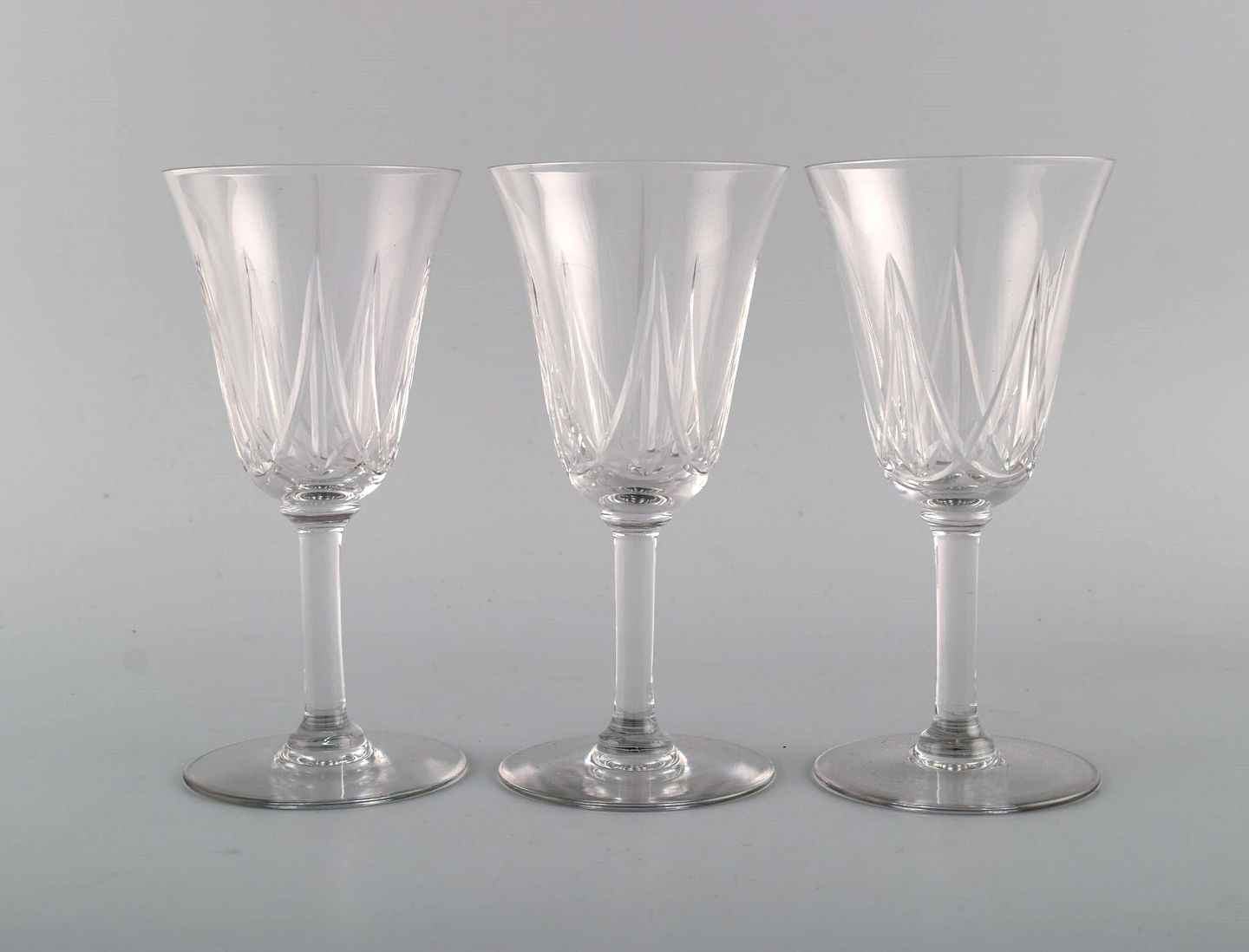 St. Louis, Belgien. Tre hvidvinsglas i mundblæst krystalglas. 1930/40'erne.